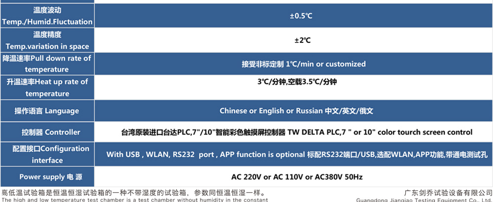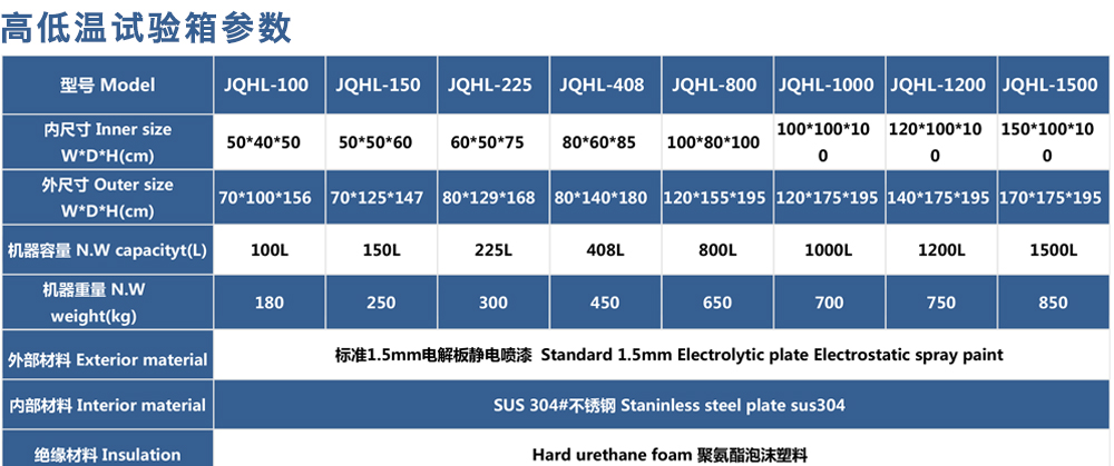 用途:高低溫試驗箱 JQHL-100L-1000L為電子、電工、儀表、零部件、材料等試驗樣品進行高溫、低溫、或者恒定試驗的溫度環境變化后的參數及性能測試。適用于汽車、航空、高校,專業實驗室研究開發