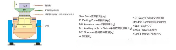 由于三軸電磁振動臺的主參數(shù)是以激振力大小命名與排序的,根據(jù)已知的參數(shù),利用∑ m x a= ( mmm+ m4) x a計算出激振力的大小,并加1.3安全系數(shù),便能確定在加速度區(qū)域所需的激振力的大小,并以此作為選定相應型號的依據(jù)。